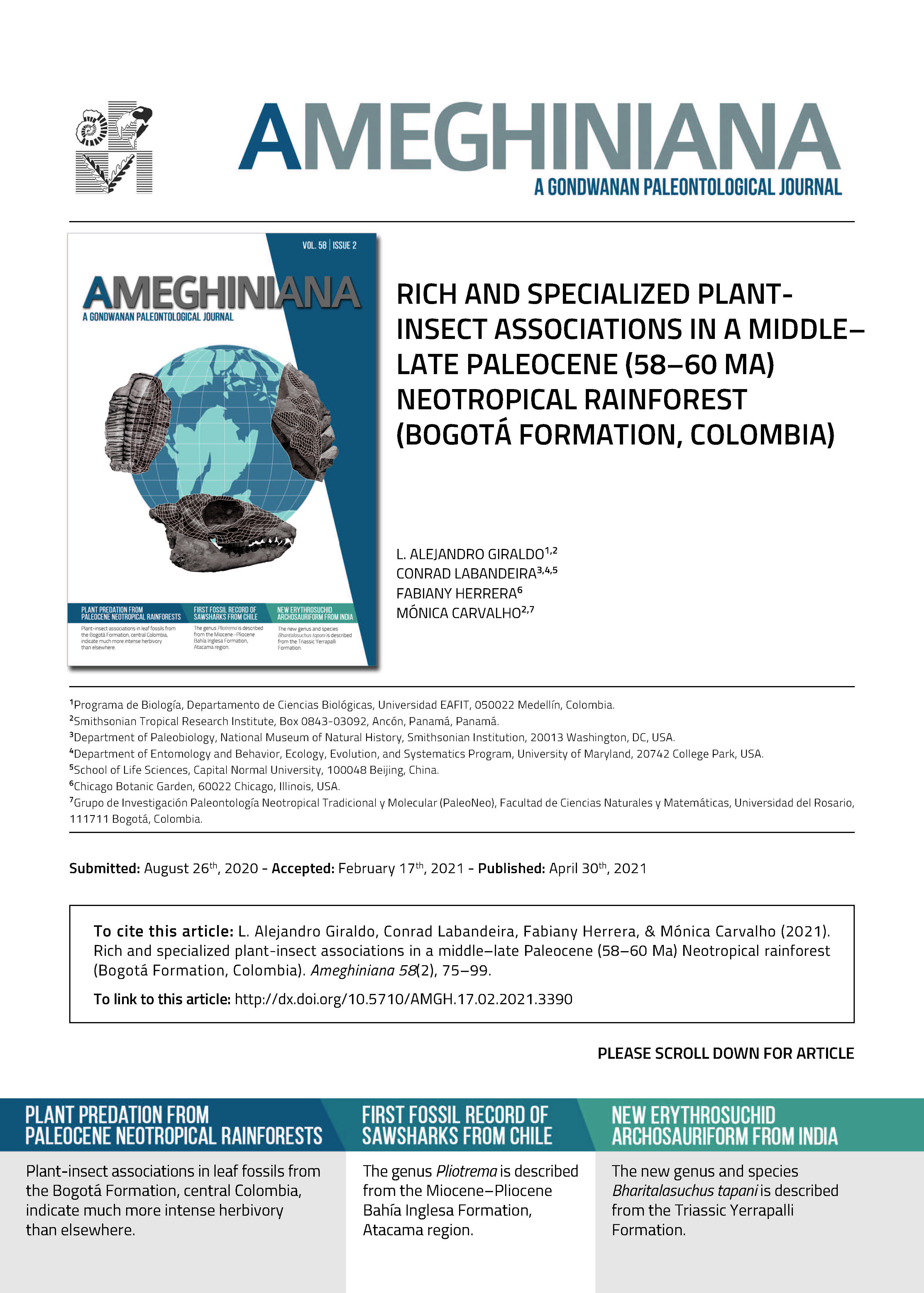HIGHLIGHTS -PLANT PREDATION FROM PALEOCENE NEOTROPICAL RAINFORESTS -FIRST FOSSIL RECORD OF SAWSHARKS FROM CHILE -NEW ERYTHROSUCHID ARCHOSAURIFORM FROM INDIA